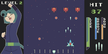The gameplay itself was plenty fun - a simple space shooter with the slight twist of requiring keeping in rhythm, to attack. There's plenty of help to keep in rhythm, such as the adorable Clover dancing on the side of the screen (so cute - I just enjoy seeing him having fun X3c ). I didn't find it hard at all to stay on beat or maintain a full Groove bar - it's quite generous. The music is fitting and decently fun. My favorite of them all is the boss battle, of course - I love the bass-y synth, throughout, that drops when the boss slides into view! :D
